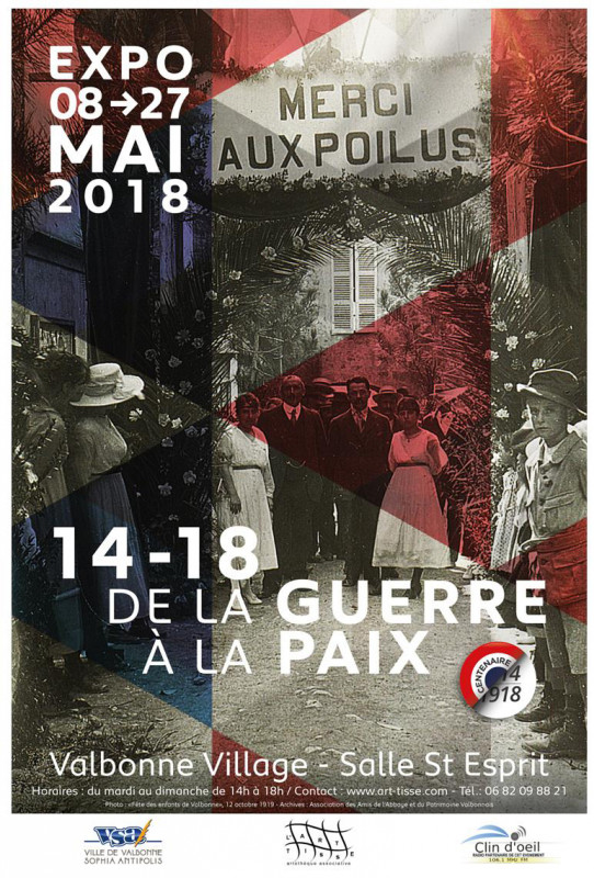-Du 8 au 27 mai 2018 : exposition "14-18 : de la guerre à la paix"  à la Salle Saint-Esprit de Valbonne. Cette exposition qui clôturait le cycle mémoriel du Centenaire était centrée sur un mur "de la guerre à la paix" réalisé par les élèves des quatre groupes scolaires de la commune et les artistes de l'Artothèque avec un assemblage de 400 briques de bois. Elle intègrait aussi entre autres les travaux du colletif Catlac sous le titre "Permissions" revisitant des photos emblématiques du parcours du chasseur alpin Albert Pourcel auquel l'association a consacré un film vidéo et un livre.